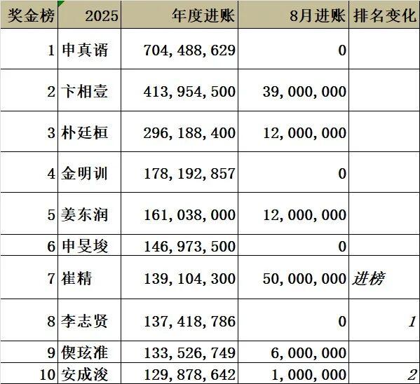 奖金榜方面,申真谞一骑绝尘,之后是卞相壹、朴廷桓、金明训、姜东润、申旻埈、崔精、李志贤、偰玹准、安成浚等。