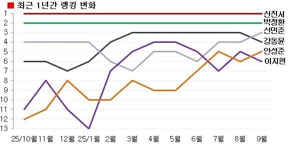 右侧从高到低依次:申真谞,朴廷桓,申旻埈,姜东润,安成浚,李志贤,排名第7的卞相壹未列其中。