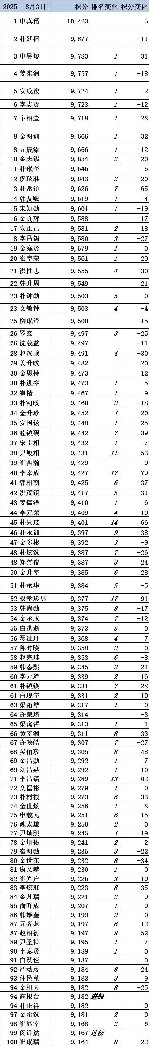 上升一个名次的申旻埈九段在12个月后重返第三位。8月2胜,31分。安成浚九段也上升一位升至第五位。