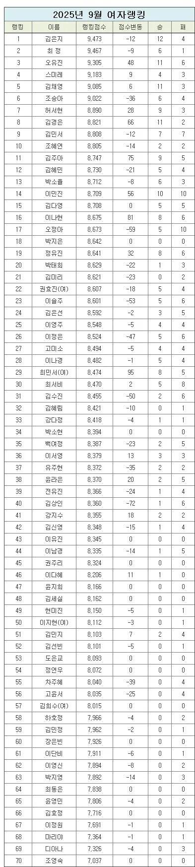 在女子排名中,金恩持九段连续两个月位居第一。连续获得第一名是个人首次。累计排名第6位。在排名分数上,8月份虽然取得了12胜4负的成绩,但失掉了12分。与连续2个月排在第2位的崔精9段的分数差是6分。崔精在8月份以6胜2负失去了9分。